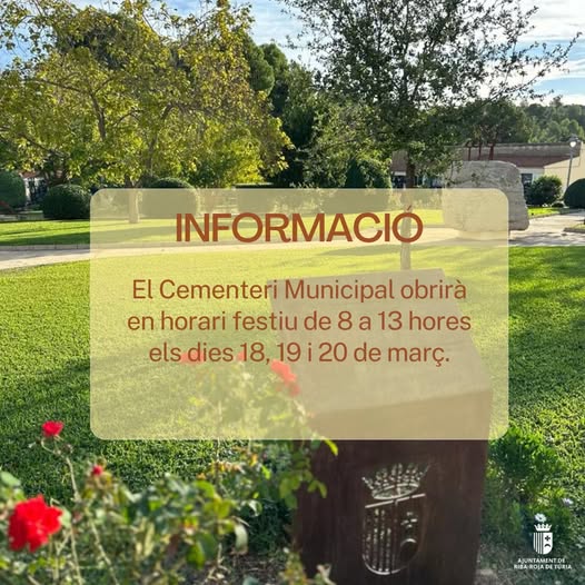 Horari del Cementeri Municipal tardor-hivern. L'Ajuntament de Riba-roja amplia els horaris del Cementeri Municipal amb motiu de la festivitat de Tots els Sants, a partir del 9 d'octubre horari de 08.00 a 18.00 hores ininterrompudament.