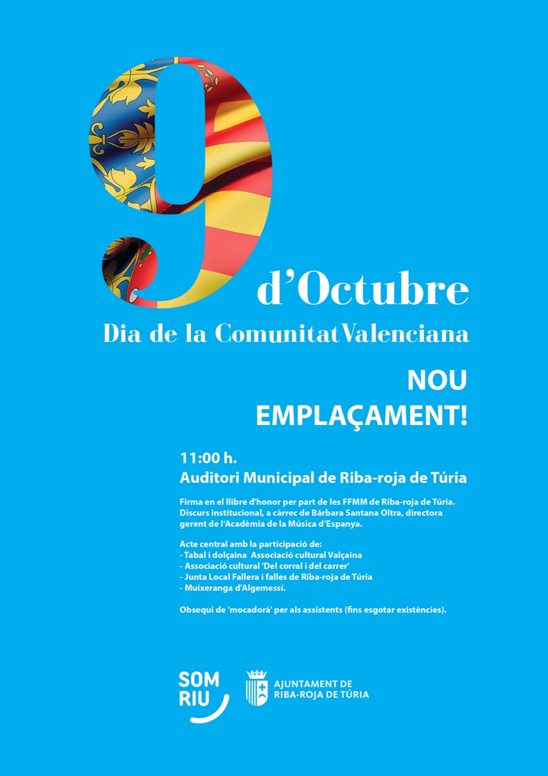 Amb motiu de l'alerta taronja decretada per AEMET des d'aquesta matinada fins a les 12.00 hores del dijous 9 d'octubre, l'acte institucional del 9 d'octubre es trasllada l' Auditori Municipal. Així s'ha decidit en la reunió del CECOPAL realitzada aquest migdia al Saló de Plens.
