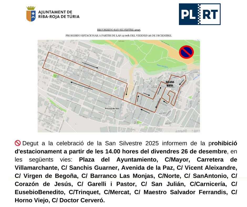 Degut a la celebració de la San Silvestre 2025 informem de la prohibició d'estacionament a partir de les 14.00 hores del divendres 26 de desembre, en les següents vies: