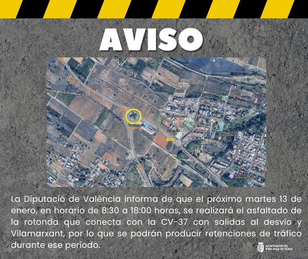 La Diputació de València informa que dimarts que ve 13 de gener, en horari de 8.30 a 18.00 hores, es realitzarà l'asfaltat de la rotonda que connecta amb la CV-37 amb eixides al desviament i Vilamarxant, per la qual cosa es podràn produir retencions de trànsit durant aquest període.
