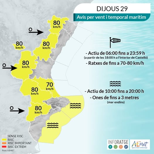 El divendres 30 el vent serà puntualment molest durant bona part del dia, amb algunes ratxes que poden superar els 55 km/h, i serà fort de cara a la segona part de la nit, amb ratxes entre els 58-84 km/h.
