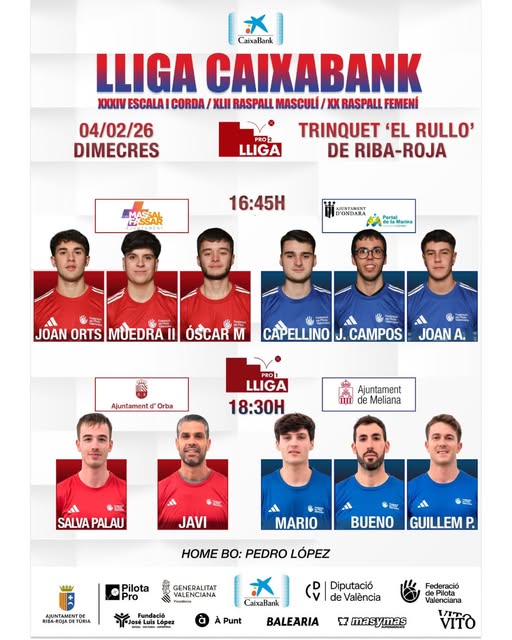 Huí, dimecres 4 de febrer, pilota valenciana al nostre Trinquet Municipal "El Rullo" de la Lliga Caixabank 2026.