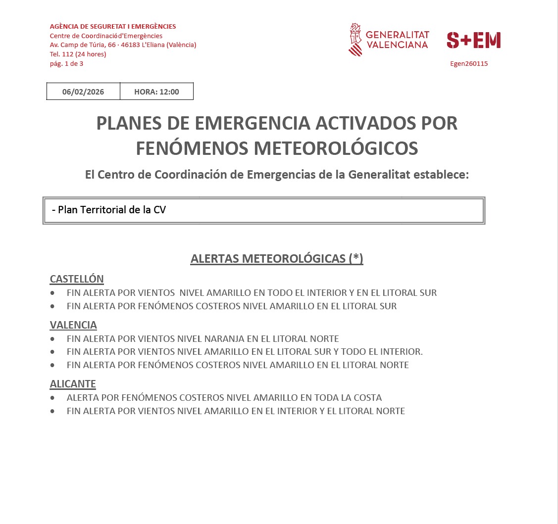 El Centre de Coordinació d'Emergències dona per finalitzades totes les alertes meteorològiques per vent en la Comunitat Valenciana.