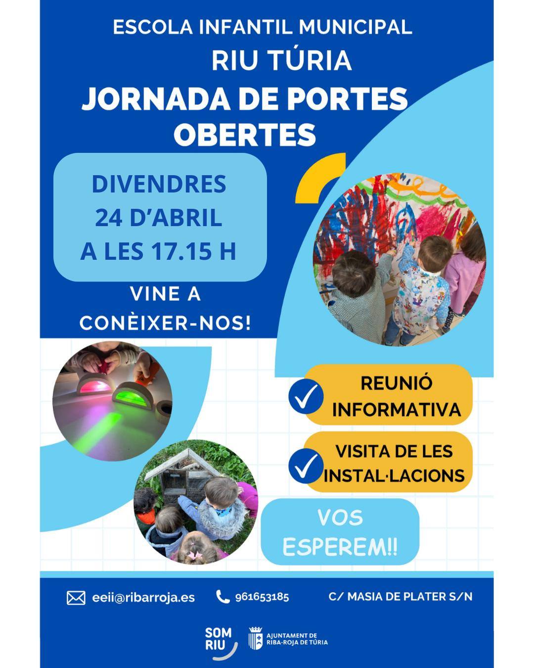 El divendres 24 d'abril a les 17.15 hores, tindrà lloc la jornada de portes obertes de l'Escola Infantil Municipal Riu Túria amb una reunió informativa i visita a les instal·lacions.