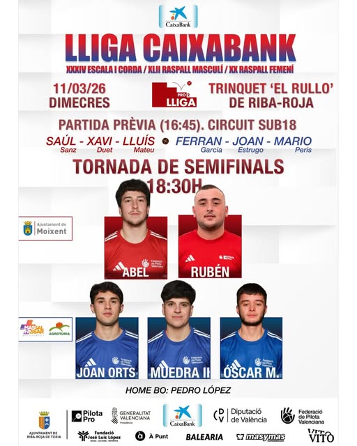 Hui, dimecres 11 de març pilota valenciana al nostre Trinquet Municipal "El Rullo" de la Lliga Caixabank 2026.