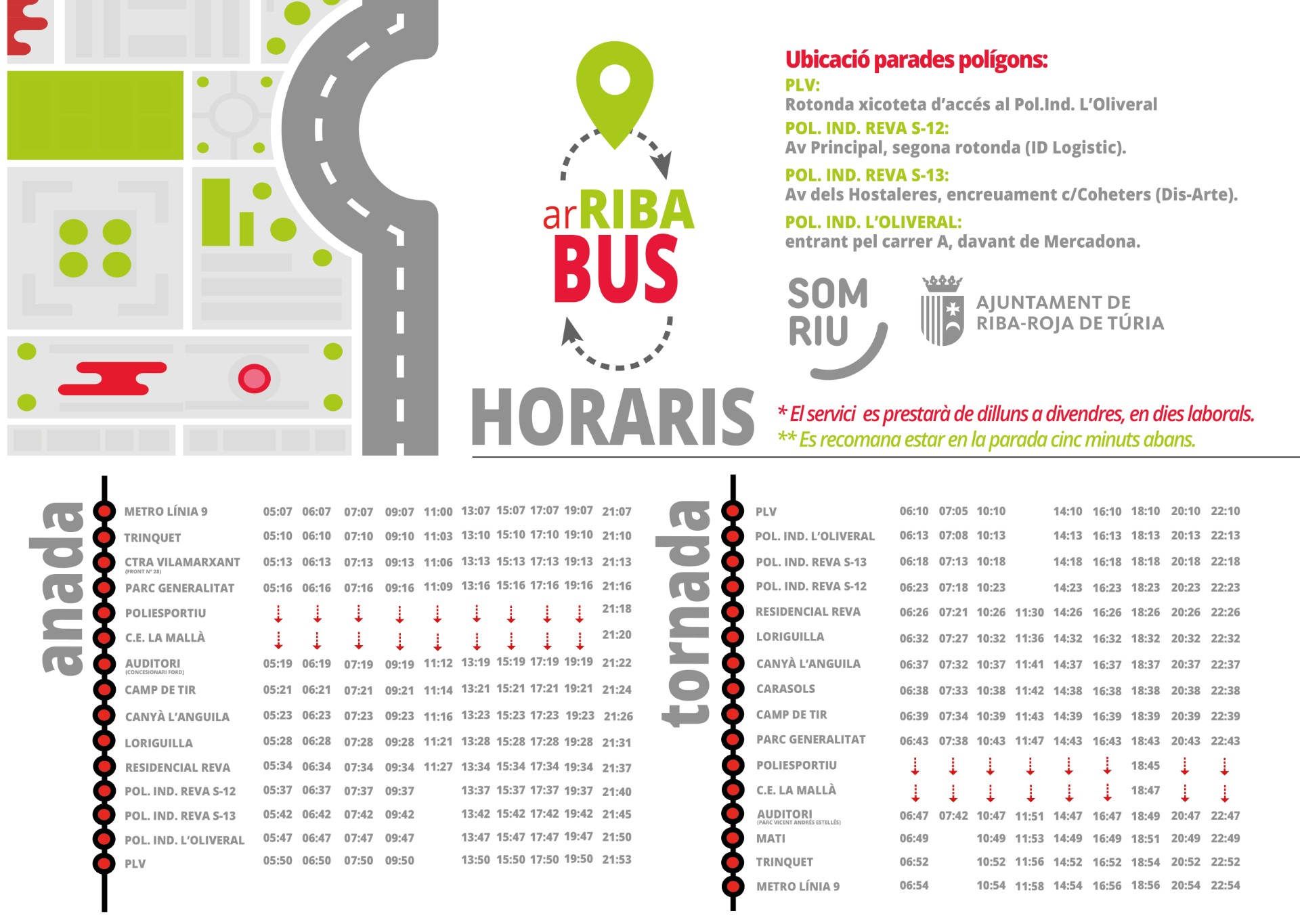 Bus d'anada; 9:07 i a les 17:07 (inici recorregut des d'estació de metro Línia 9).