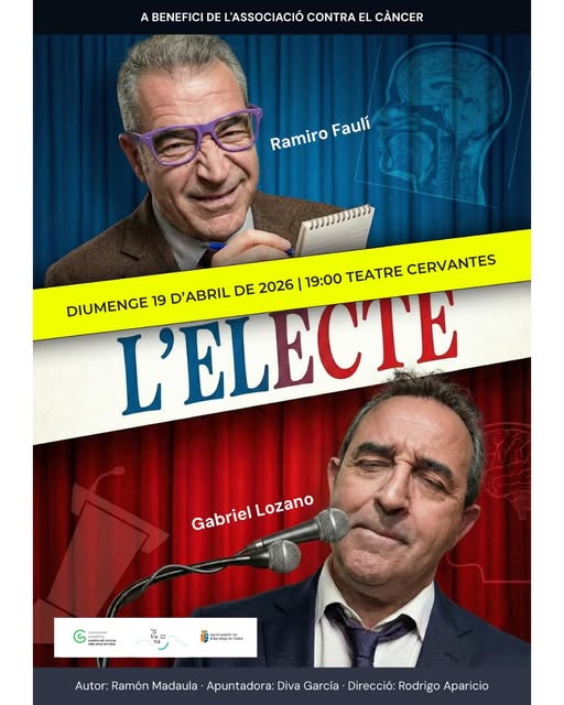 L'Associació Contra el Càncer en Riba-roja de Túria et proposa una vesprada de teatre solidari a benefici de Associació Contra el Càncer amb l'obra "L'electe" de Ramón Madaula, i interpretació de Ramiro Faulí i Gabriel Lozano.