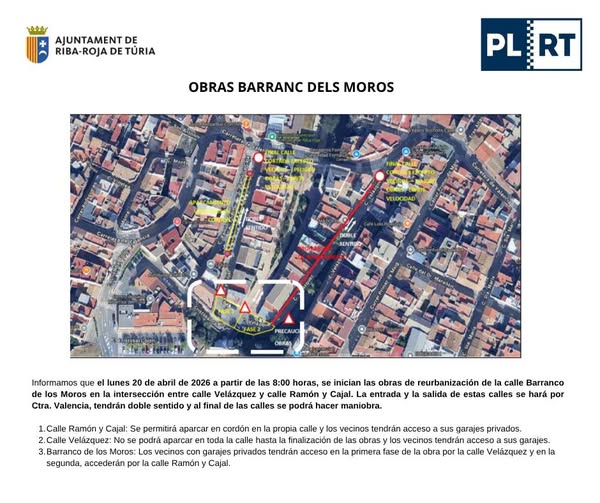 S'informa que el dilluns 20 d'abril de 2026, a partir de les 08:00 hores, donaran principi les obres de reurbanització al carrer Barranco dels Moros, en el tram comprès entre carrer Velázquez i carrer Ramón y Cajal.