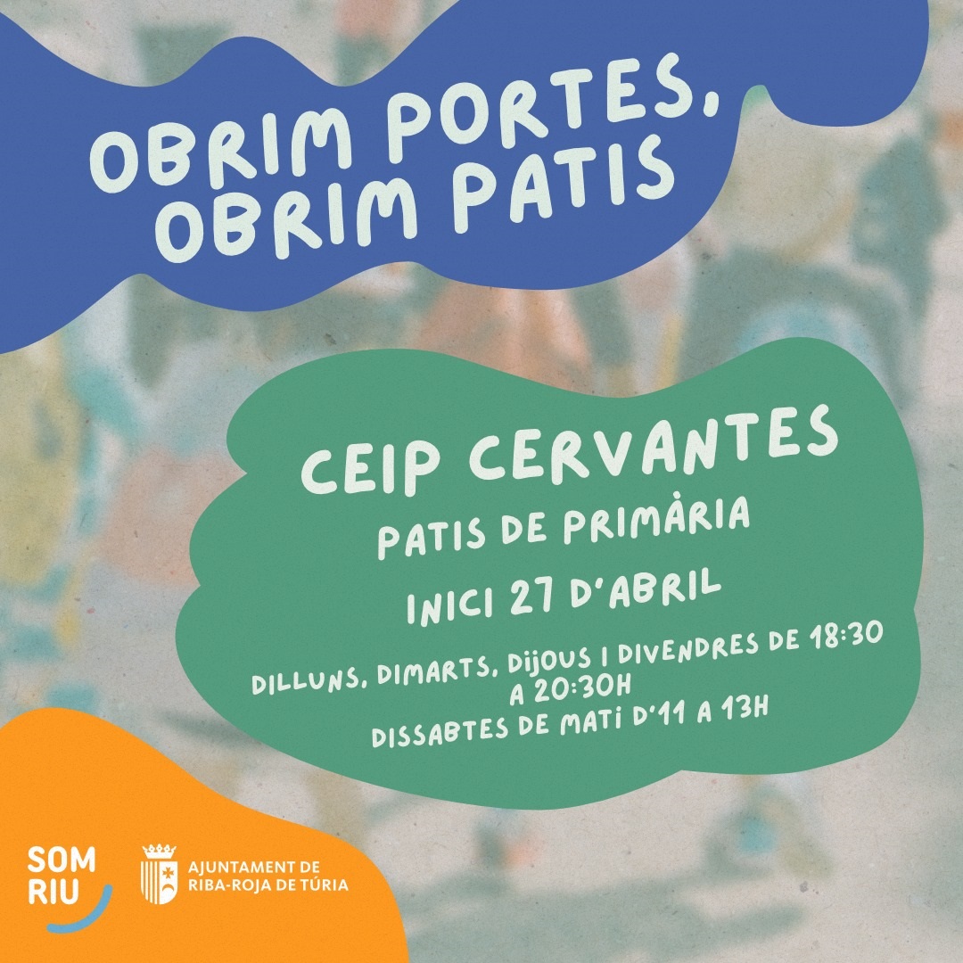 Des del dilluns 27 d'abril fins a la finalització del curs escolar, el pati del CEIP Cervantes romandrà obert dilluns, dimarts, dijous i divendres de 18:30 a 20:30 h i també dissabtes de matí d'11 a 13h.
