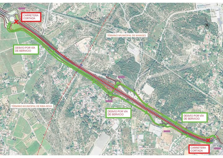 Se mantendrá el corte en el tramo afectado de la CV-370. El tráfico será desviado por las nuevas vías de servicio recientemente ejecutadas. El acceso a las urbanizaciones se realizará a través de dichas vías, quedando prohibidos los giros a la izquierda.